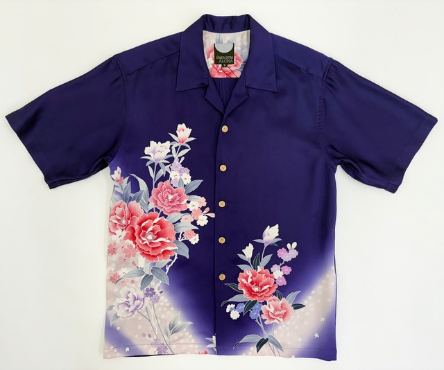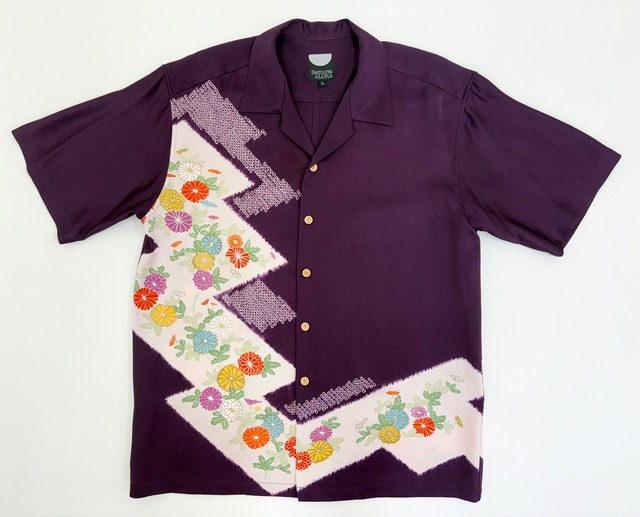 ——————————————————————— サムライアロハシャツ サイズ:M 素材: 絹(シルク) ボタン:竹ボタン No.32421747 ——————————————————————— ヴィンテージの着物生地を使ってお仕立てした一点もののアロハシャツ。 春夏の着こなしのアクセントになる一枚です。 竹ボタンがアロハシャツらしい暖かい印象を与えつつ、綺麗目なスタイルに仕上げ、 脇と背中心を折り伏せ縫いでお仕立てした、本格高級アロハシャツです。 前のボタンを留めて一枚で着ていただくことも、 ティーシャツ等の上に一枚軽く羽織っていただくこともできます。 是非ご自身のコーディネートにあわせた自由なスタイリングを楽しんでください。 すべてのアロハシャツは東北地方の針子の皆様及び縫製工場にて、 一つ一つ丁寧に、裁断、洗い、縫製を経て、皆様のお手元に届きます。 ユニセックスで男女どちらでもお召しになっていただけます。 ※こちらはヴィンテージ着物を使用したリメイク商品です。 着物をほどいたのちに全て洗いをかけておりますが、経年のために多少生地の色あせ・シミ・擦り切れ等がある場合がございます。 また、サイズ表はありますが一枚一枚素材が異なるため、出来上がった際のサイズが多少異なることがあります。 あらかじめご了承ください。 【お手入れ】 ドライクリーニングをお勧めしております。 ※着物の生地は非常に繊細な場合がございますので お取り扱いにはじゅうぶんお気をつけください。 アイロンの際には必ず低温で裏から当て布をして優しくおかけてください。 【返品・交換について】 お送りする前に一着一着丁寧に検品後 発送しております。 基本的に商品到着後の返品・交換は行っておりません。 ::::::::::::::::::::::::::::: ー SAMURAI ALOHAとはー 私たちSAMURAI ALOHAは着られなくなった着物を選別し、宮城県のお母さん達の手で一着ずつ丁寧にほぐして洗い、裁断し、福島県、岩手県の縫製工場の皆さんの手でアロハシャツに仕立て直しています。 アロハシャツの原点は日本の着物です。 十九世紀末から二十世紀初頭にかけてハワイに移民として渡った日本人が、自分たちの着物をほぐして、開襟シャツに仕立て直したのがアロハシャツの始まりと言われています。 日本の着物が原点のアロハシャツを東北でもう一度、復活させたのが私達の「サムライアロハ」です。私達のアロハシャツは全て一点物です。 ぜひ、あなたに合った世界で一つだけの「サムライアロハ」を見つけてください。