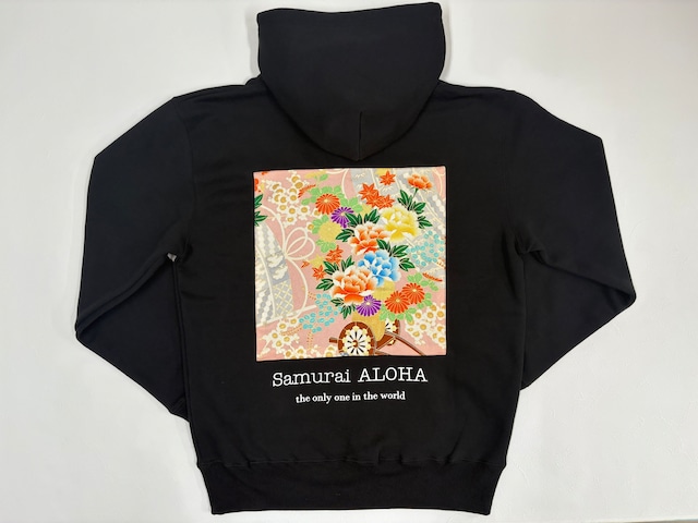 ——————————————————————— サムライアロハパーカー(裏起毛) サイズ: S 素材:本体 綿52% ポリエステル48% 着物部分 シルク100% No. 82613002 ——————————————————————— ヴィンテージの着物生地を背中に縫い合わせたパーカーになります。 表糸は毛玉ができにくい綿100%、裏起毛 日常でも着やすく、気軽に和文化を楽しめるアイテムになります。 是非ご自身のコーディネートにあわせた自由なスタイリングを楽しんでください。 すべての着物生地は東北地方の針子の皆様及び縫製工場にて、 一つ一つ丁寧に、裁断、洗い、縫製を経て、皆様のお手元に届きます。 ユニセックスで男女どちらでもお召しになっていただけます。 ※ こちらはヴィンテージ着物を使用したリメイク商品です。 着物をほどいたのちに全て洗いをかけておりますが、経年のために多少生地の色あせ・シミ・擦り切れ等がある場合がございます。 【お手入れ】 通常洗濯で洗えますが着物部分はシルクの為、シワや縮みが発生する場合があります。 その際は、着物部分にアイロンをおかけください。 アイロンの際には必ず低温で当て布をして優しくおかけてください。 ※ 着物の生地は非常に繊細な場合がございますので お取り扱いにはじゅうぶんお気をつけください。 【返品・交換について】 お送りする前に一着一着丁寧に検品後 発送しております。 基本的に商品到着後の返品・交換は行っておりません。 ::::::::::::::::::::::::::::: ー SAMURAI ALOHAとはー 私たちSAMURAI ALOHAは着られなくなった着物を選別し、宮城県のお母さん達の手で一着ずつ丁寧にほぐして洗い、裁断し、福島県、岩手県の縫製工場の皆さんの手でアロハシャツに仕立て直しています。 アロハシャツの原点は日本の着物です。 十九世紀末から二十世紀初頭にかけてハワイに移民として渡った日本人が、自分たちの着物をほぐして、開襟シャツに仕立て直したのがアロハシャツの始まりと言われています。 日本の着物が原点のアロハシャツを東北でもう一度、復活させたのが私達の「サムライアロハ」です。私達のアロハシャツは全て一点物です。 ぜひ、あなたに合った世界で一つだけの「サムライアロハ」を見つけてください。