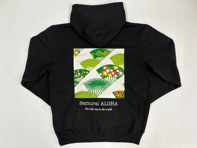 ——————————————————————— サムライアロハパーカー(裏起毛) サイズ: L 素材:本体 綿52% ポリエステル48% 着物部分 シルク100% No. 82633023 ——————————————————————— ヴィンテージの着物生地を背中に縫い合わせたパーカーになります。 表糸は毛玉ができにくい綿100%、裏起毛 日常でも着やすく、気軽に和文化を楽しめるアイテムになります。 是非ご自身のコーディネートにあわせた自由なスタイリングを楽しんでください。 すべての着物生地は東北地方の針子の皆様及び縫製工場にて、 一つ一つ丁寧に、裁断、洗い、縫製を経て、皆様のお手元に届きます。 ユニセックスで男女どちらでもお召しになっていただけます。 ※ こちらはヴィンテージ着物を使用したリメイク商品です。 着物をほどいたのちに全て洗いをかけておりますが、経年のために多少生地の色あせ・シミ・擦り切れ等がある場合がございます。 【お手入れ】 通常洗濯で洗えますが着物部分はシルクの為、シワや縮みが発生する場合があります。 その際は、着物部分にアイロンをおかけください。 アイロンの際には必ず低温で当て布をして優しくおかけてください。 ※ 着物の生地は非常に繊細な場合がございますので お取り扱いにはじゅうぶんお気をつけください。 【返品・交換について】 お送りする前に一着一着丁寧に検品後 発送しております。 基本的に商品到着後の返品・交換は行っておりません。 ::::::::::::::::::::::::::::: ー SAMURAI ALOHAとはー 私たちSAMURAI ALOHAは着られなくなった着物を選別し、宮城県のお母さん達の手で一着ずつ丁寧にほぐして洗い、裁断し、福島県、岩手県の縫製工場の皆さんの手でアロハシャツに仕立て直しています。 アロハシャツの原点は日本の着物です。 十九世紀末から二十世紀初頭にかけてハワイに移民として渡った日本人が、自分たちの着物をほぐして、開襟シャツに仕立て直したのがアロハシャツの始まりと言われています。 日本の着物が原点のアロハシャツを東北でもう一度、復活させたのが私達の「サムライアロハ」です。私達のアロハシャツは全て一点物です。 ぜひ、あなたに合った世界で一つだけの「サムライアロハ」を見つけてください。