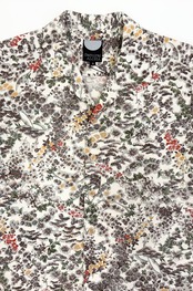 竹ボタンがアロハシャツらしい暖かい印象を与えつつ、綺麗目なスタイルに仕上げ、