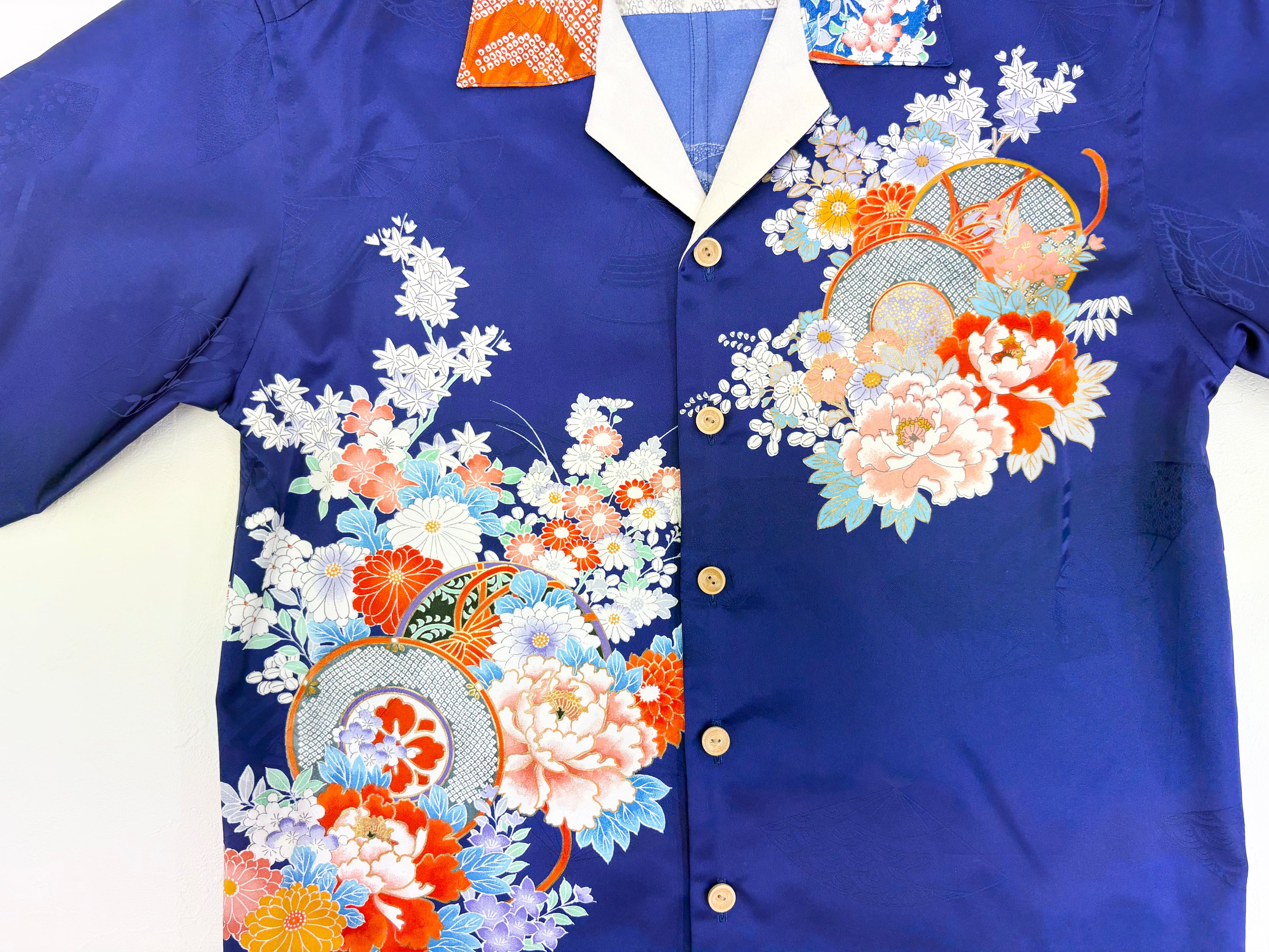 ヴィンテージの着物生地を使ってお仕立てした一点もののアロハシャツ。