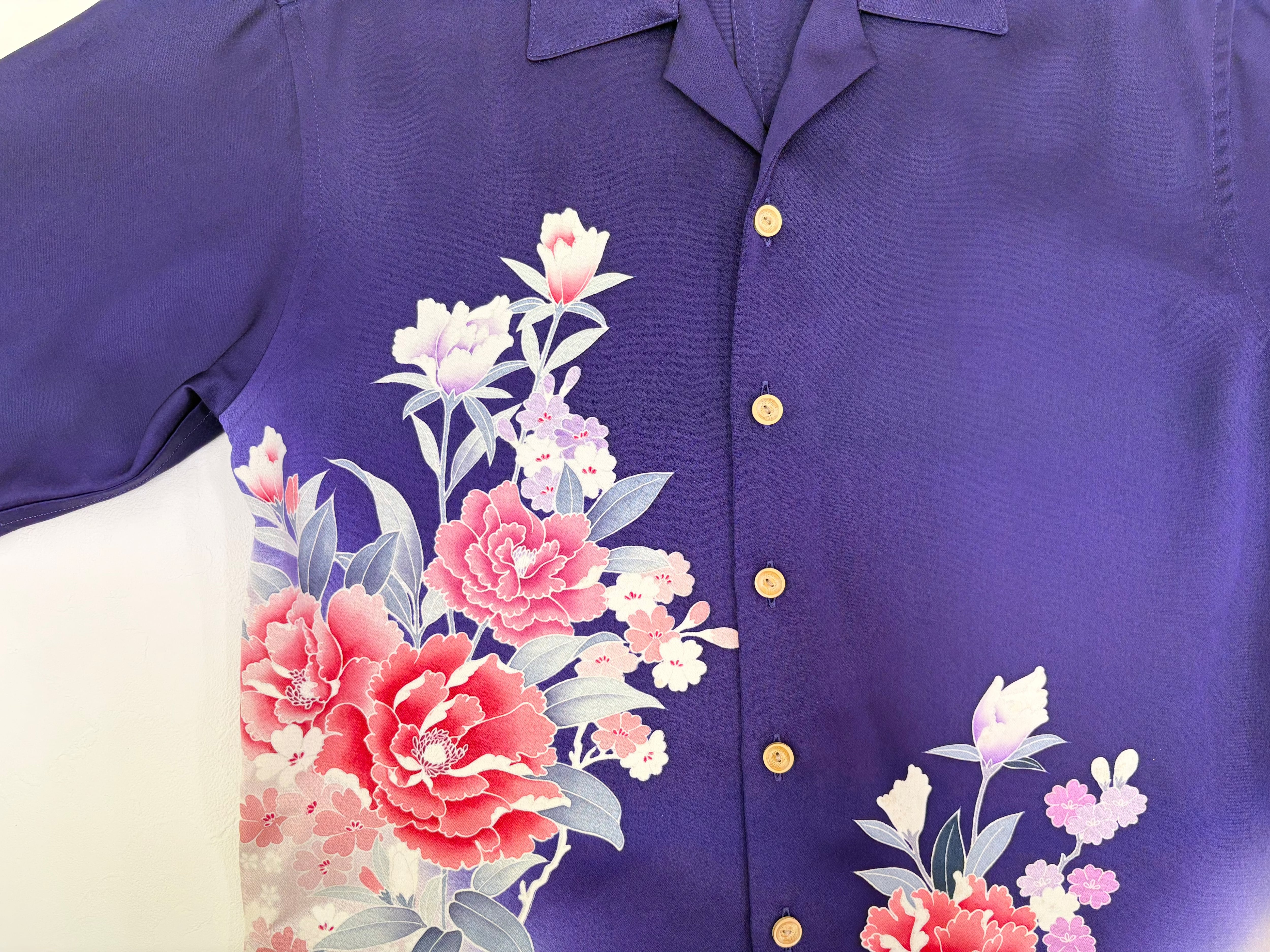 ヴィンテージの着物生地を使ってお仕立てした一点もののアロハシャツ。