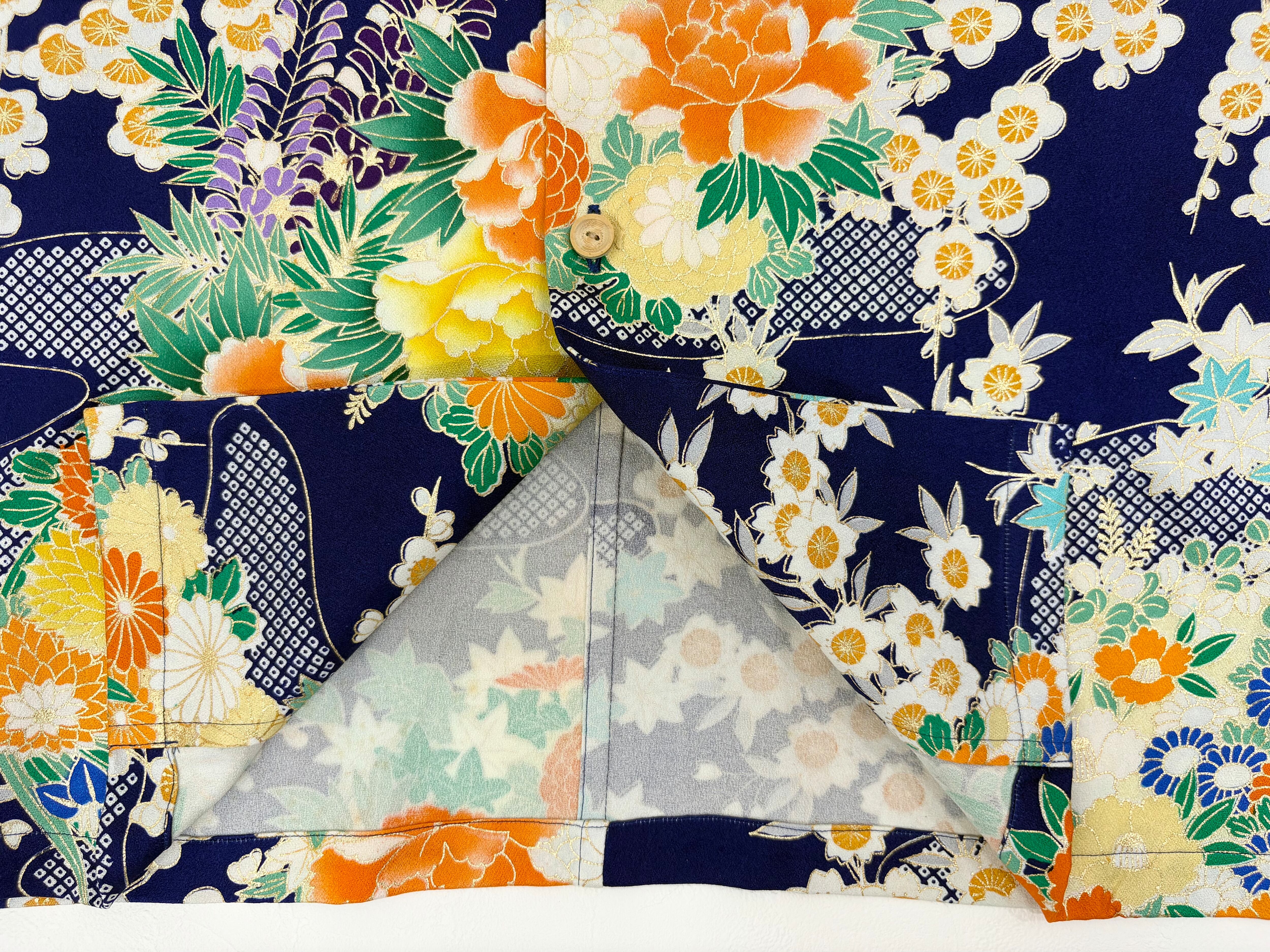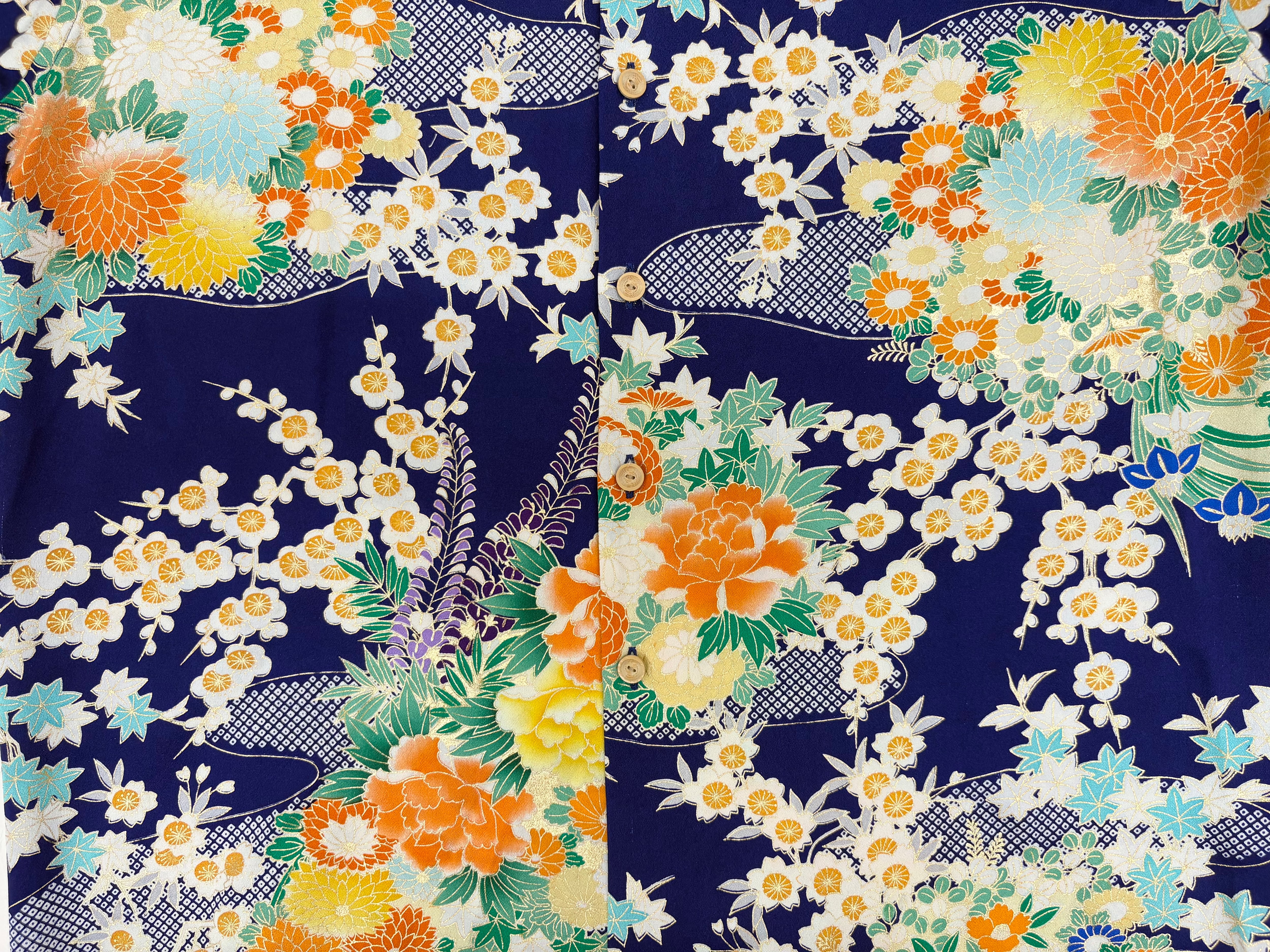 ヴィンテージの着物生地を使ってお仕立てした一点もののアロハシャツ。