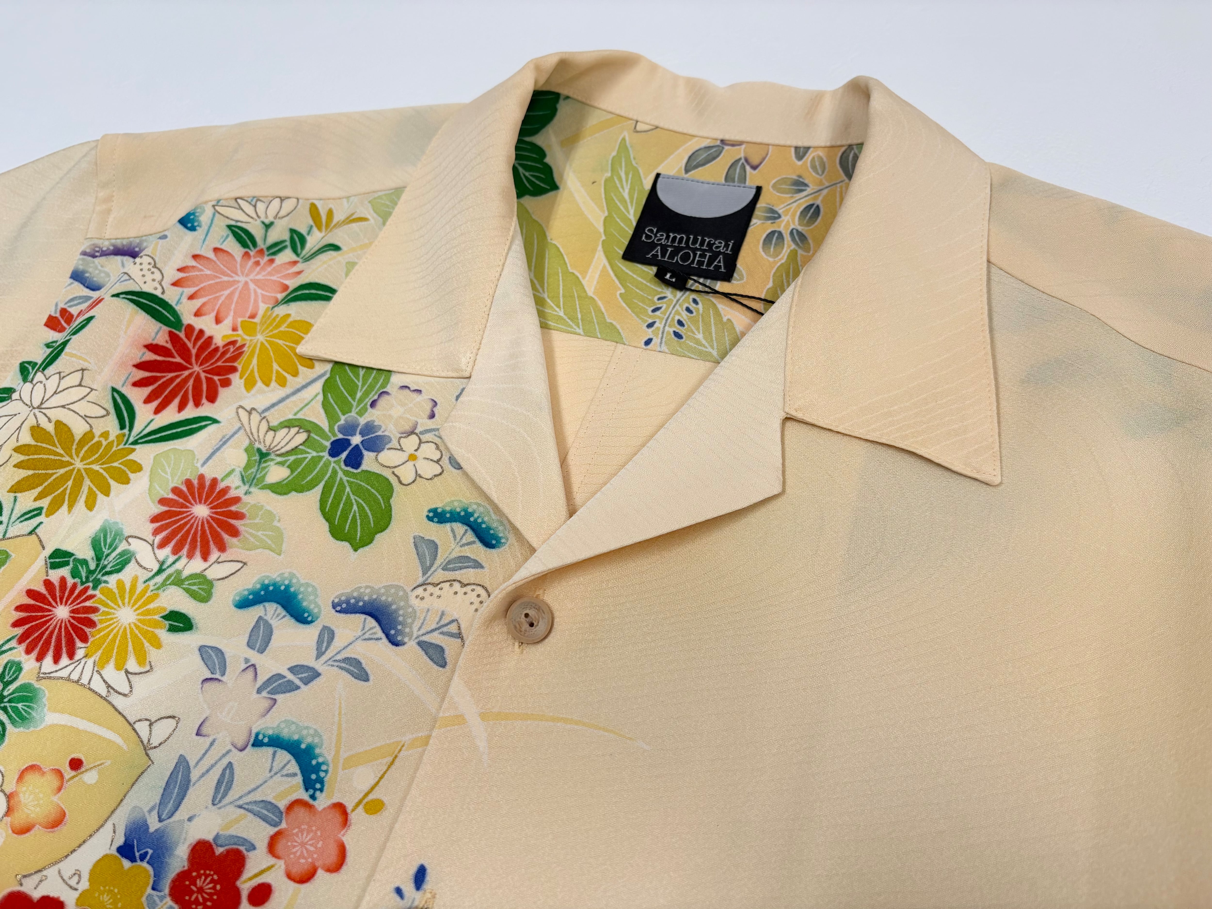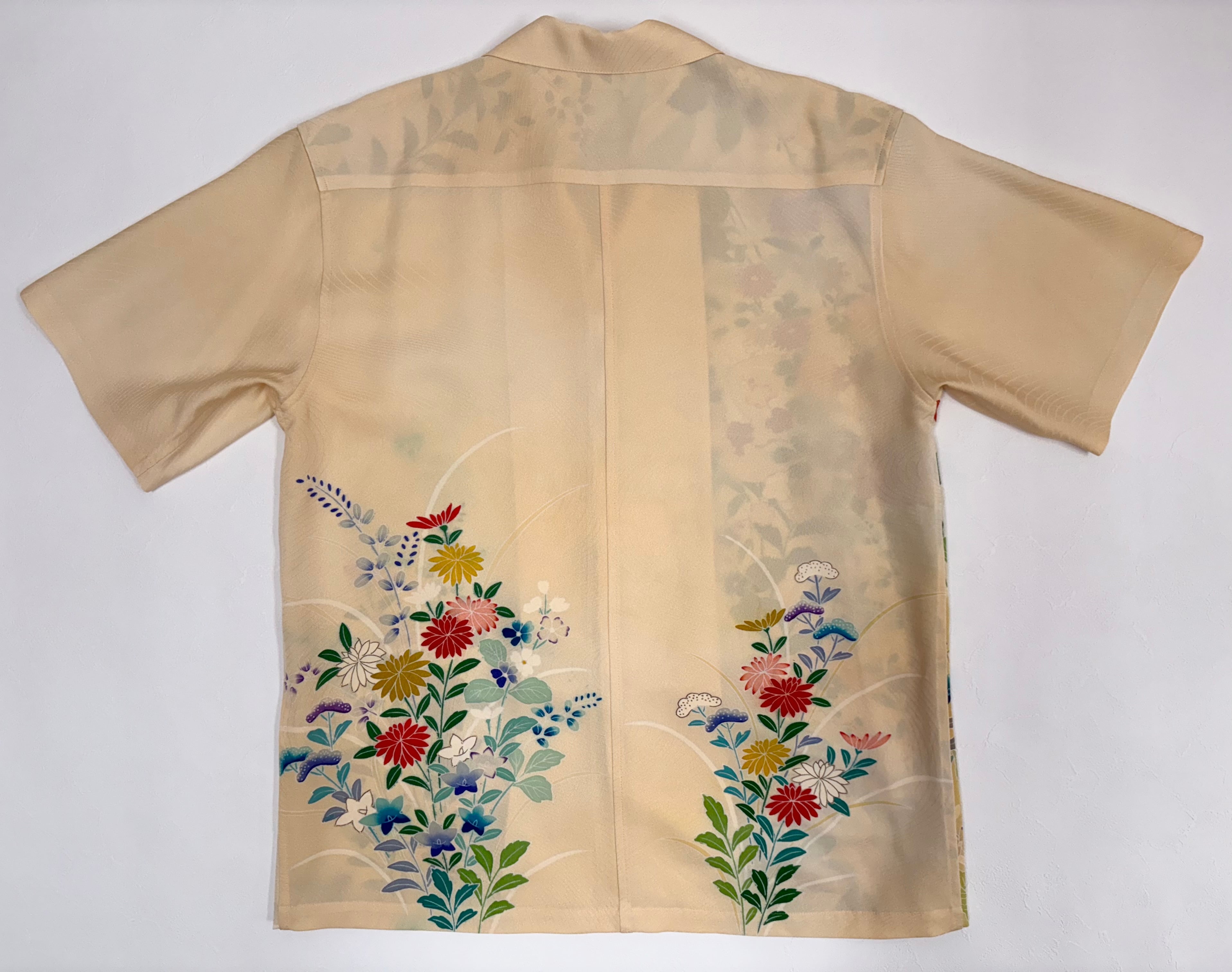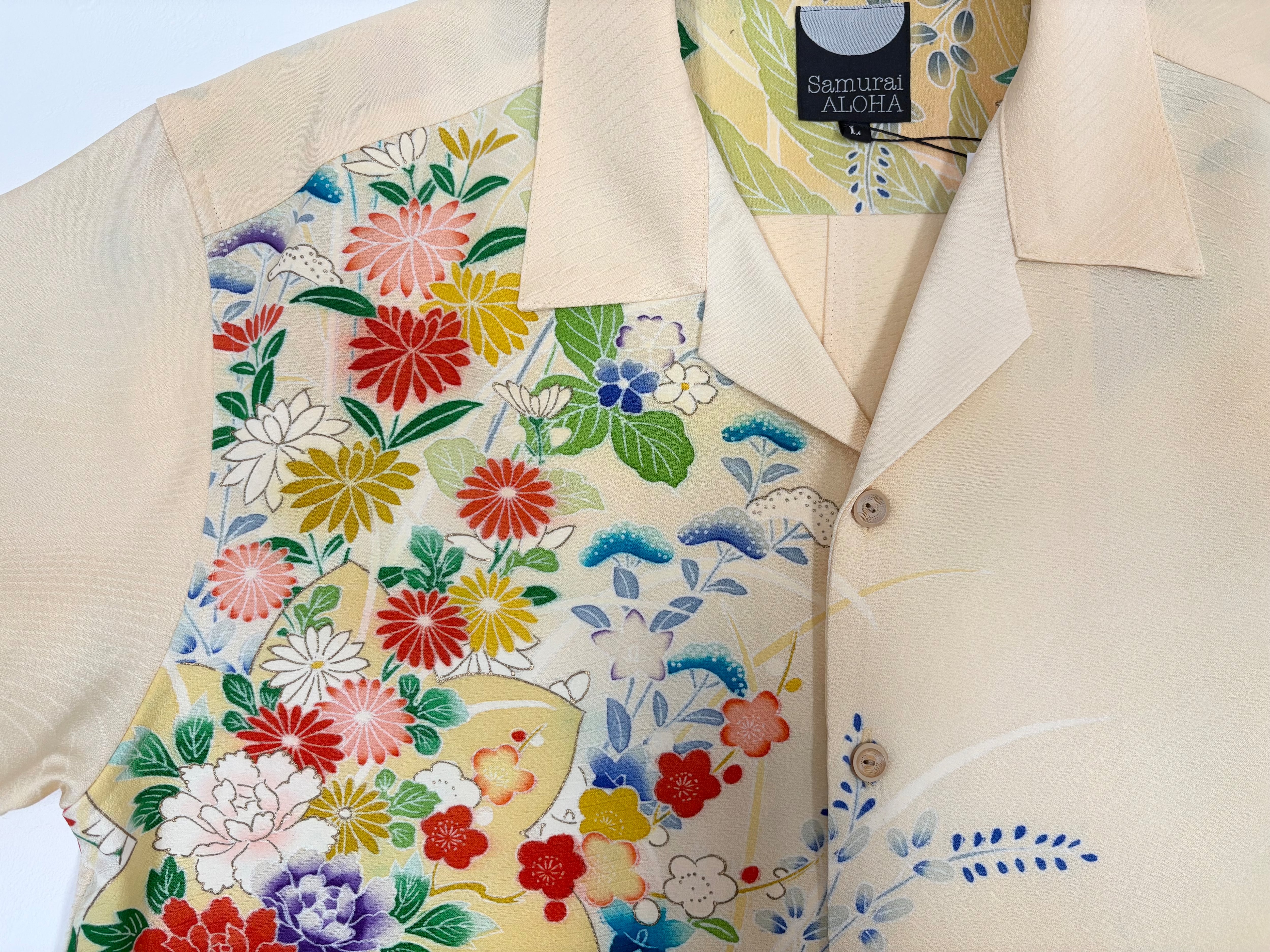 ヴィンテージの着物生地を使ってお仕立てした一点もののアロハシャツ。