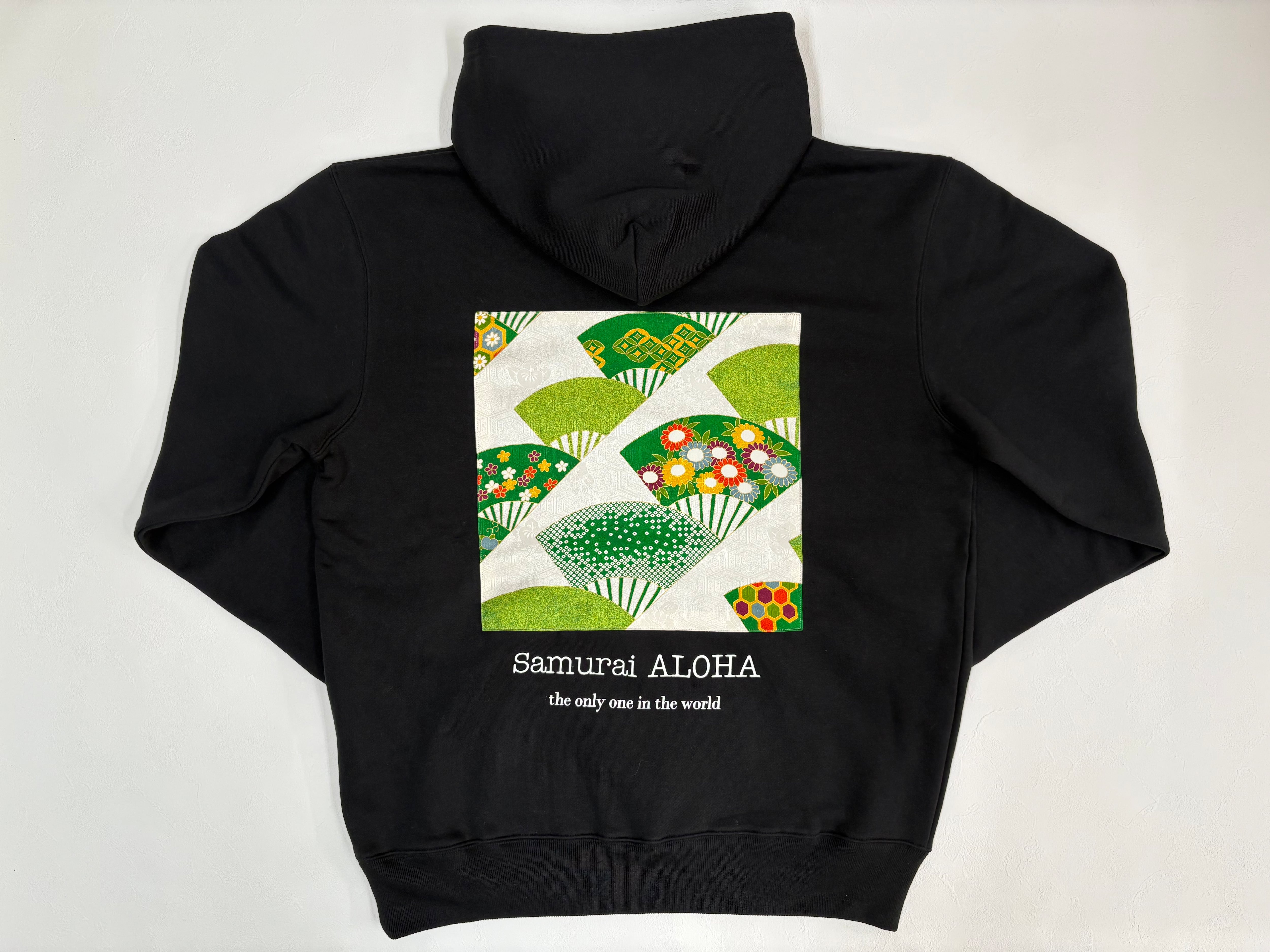 ヴィンテージの着物生地を背中に縫い合わせたパーカーになります。