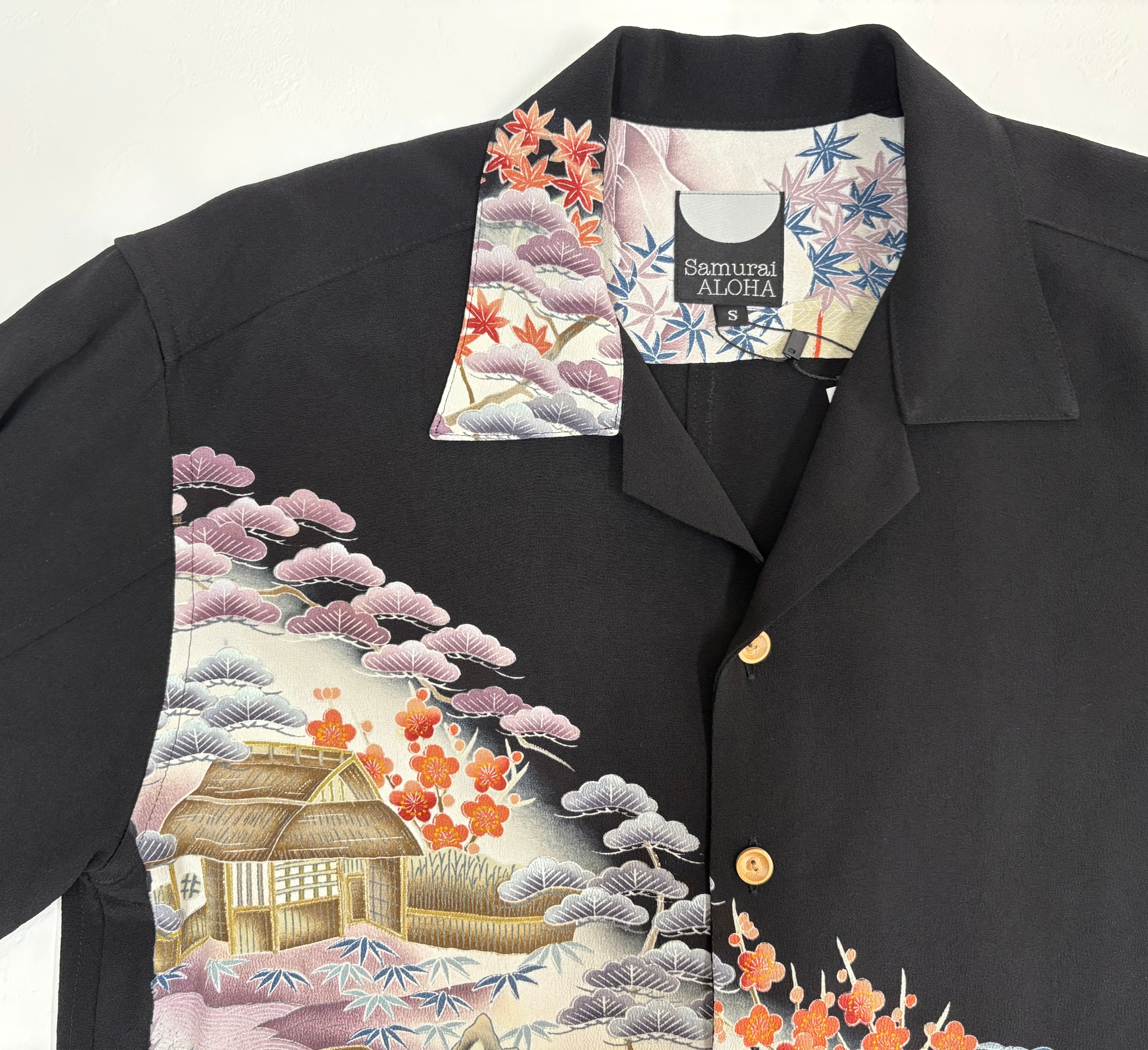 ヴィンテージの着物生地を使ってお仕立てした一点もののサムライアロハ。