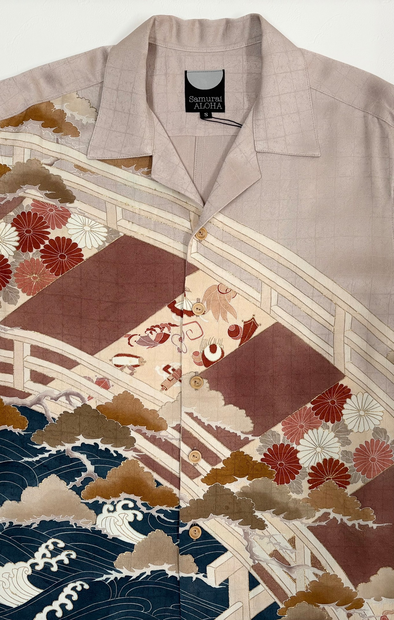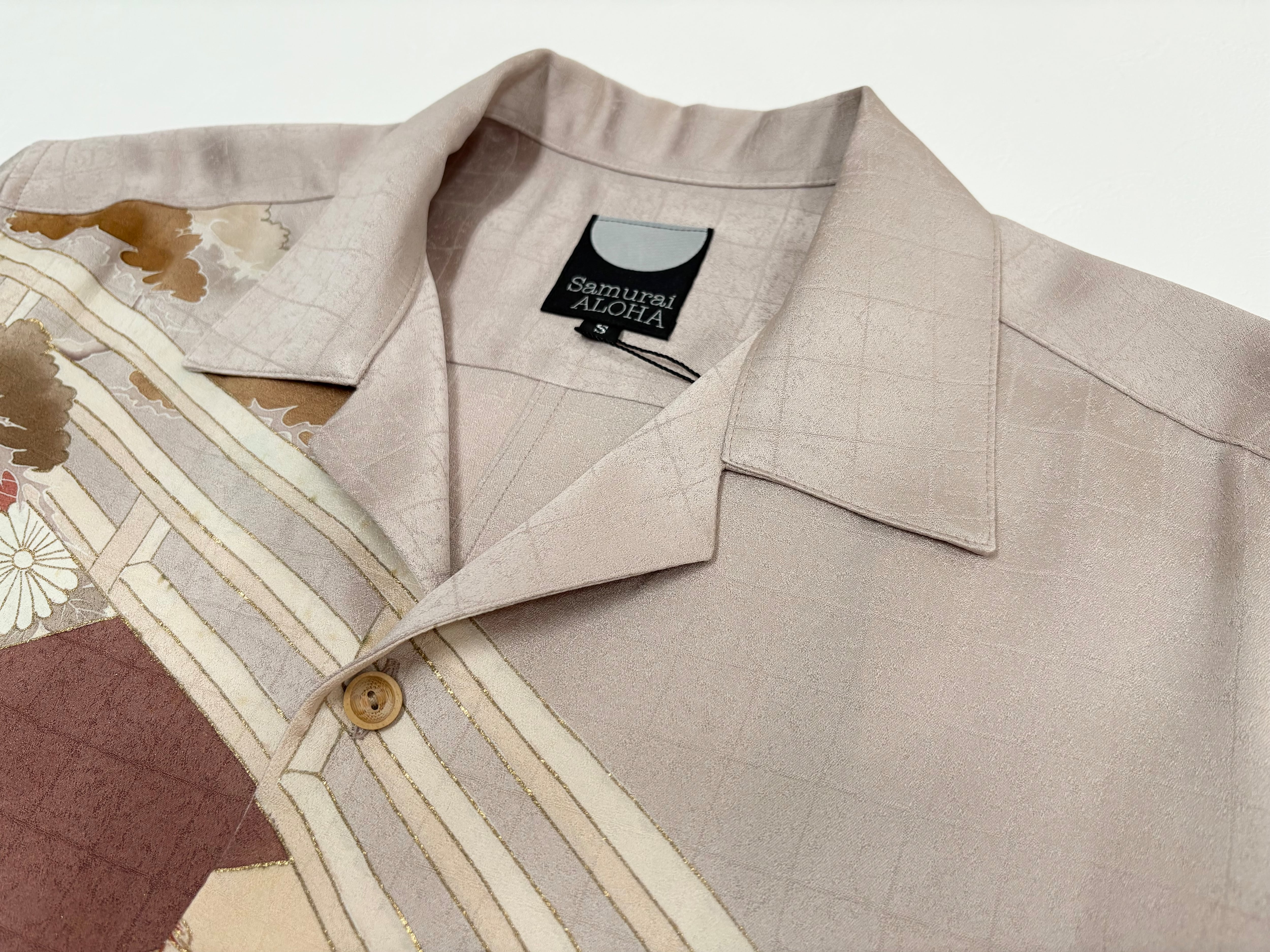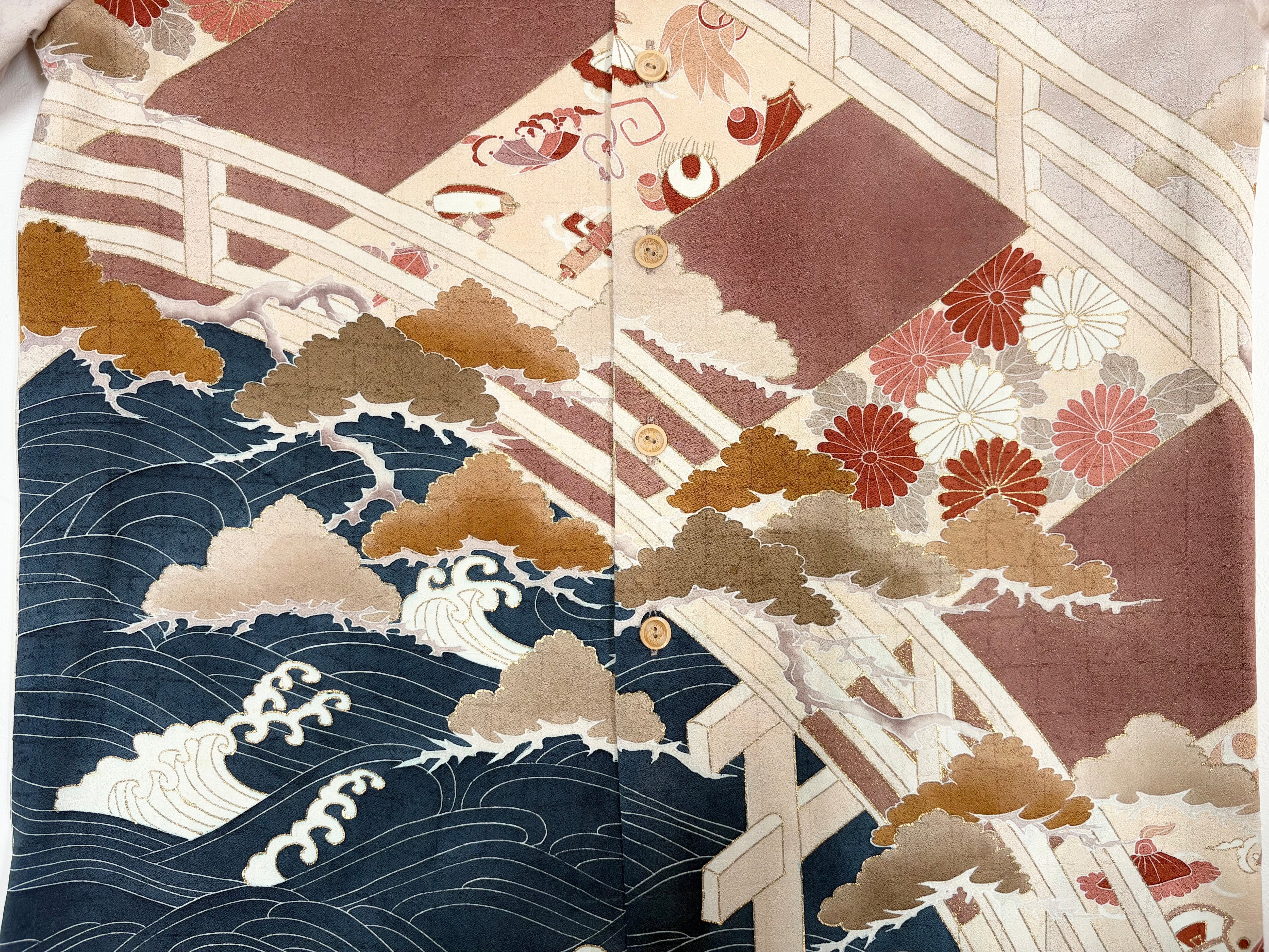 ヴィンテージの着物生地を使ってお仕立てした一点もののサムライアロハ。
