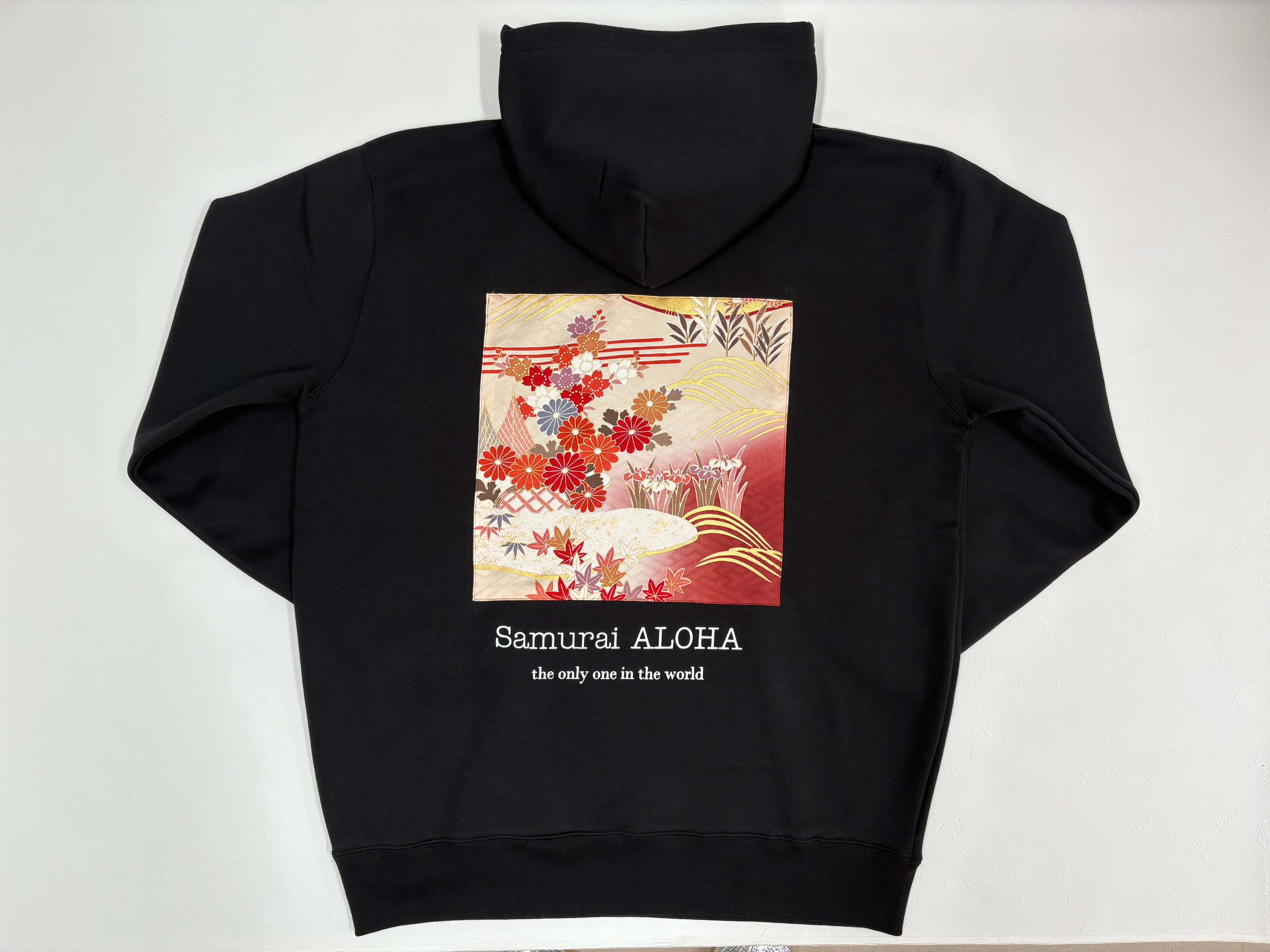ヴィンテージの着物生地を背中に縫い合わせたパーカーになります。