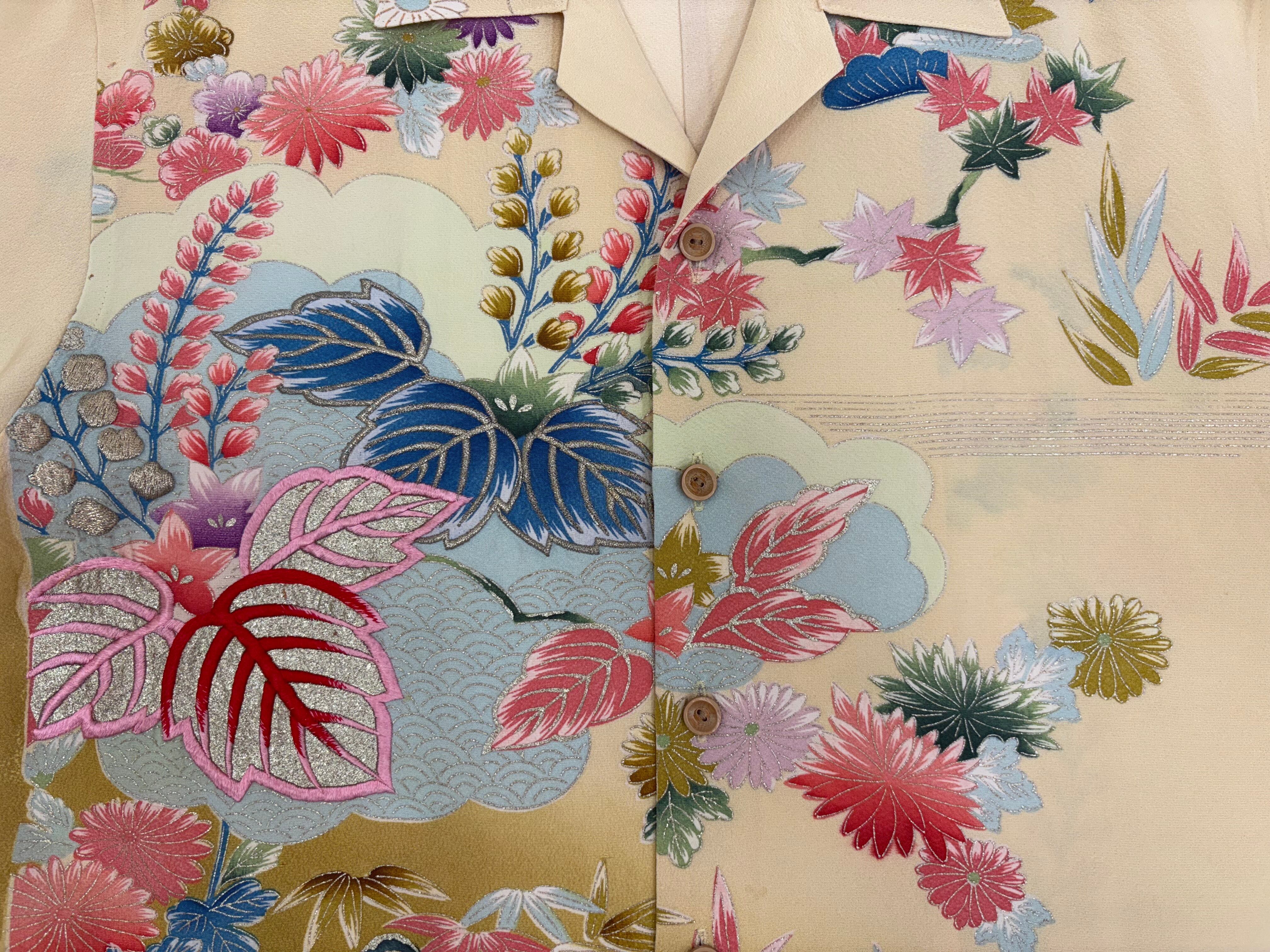 ヴィンテージの着物生地を使ってお仕立てした一点もののアロハシャツ。